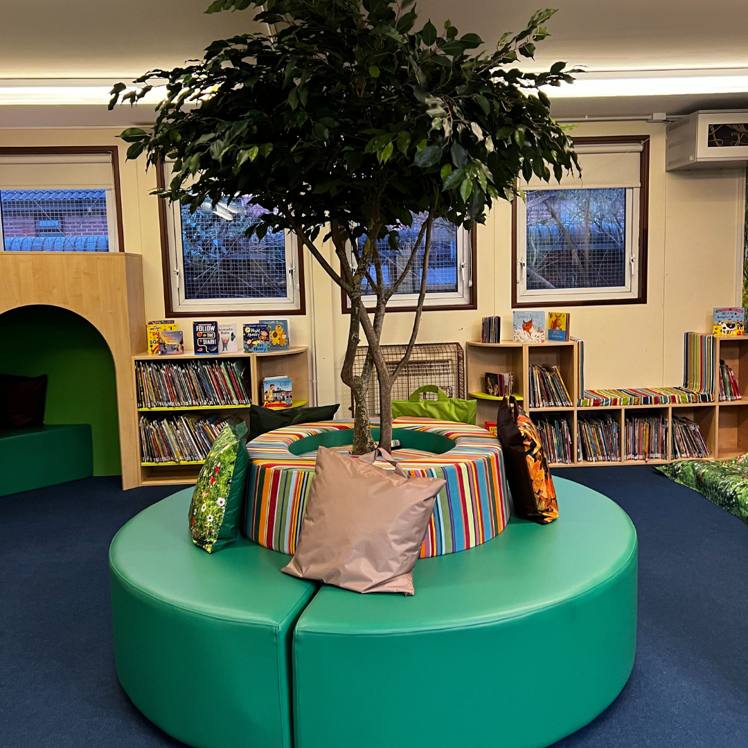 Our designers created a spectacular nature-themed library space with colourful seating, bookshelves and cushions