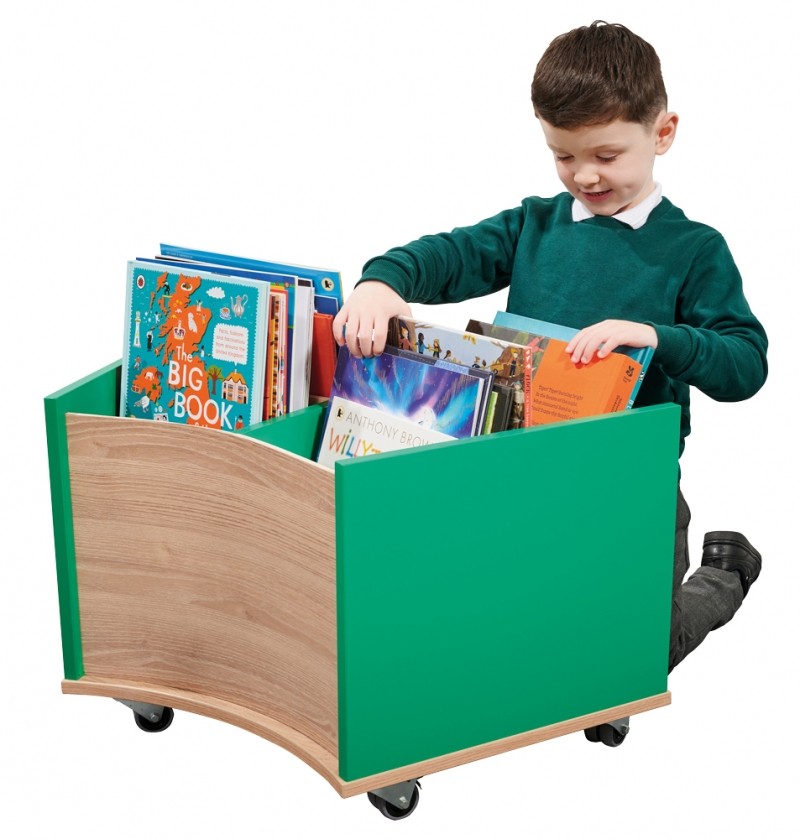 Jess included bookshelves with a variety of heights to both maximise book capacity and meet the needs of different age groups throughout the school. She explains: "We used our Apto shelving to have optional front-facing books and a self-adjustable shelf feature, and curved shelving (Curvano), curved seating (Octo) and curved kinderboxes to create a flow and identify separate zones.